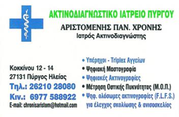 customer tabsΕπικοινωνίαΩράριο: Καθημερινά 08:00 -13:30 & 17:30 -20:002ο Ιατρείο: Καπετάν Τζορνά, Λεχαινά τηλ: 2623023002Ακτινολόγοι - Ακτινοθεραπευτές - ΡαδιολόγοιΥγείαΚόκκινου 12-14, Πύργος, ΗλείαςΠΥΡΓΟΣ ΗΛΕΙΑΣΗΛΕΙΑΠΕΛΟΠΟΝΝΗΣΟΣ 2621028080chronisaristom@hotmail.com Το προτείνω (έχει προταθεί 1 φορές) ΦωτογραφίεςFacebook LikeShare on FacebookTweet Widget