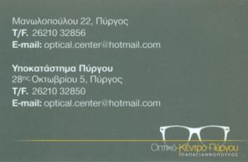 customer tabsΕπικοινωνία2η Διεύθυνση: 28ης Οκτωβρίου 3, ΠύργοςΓυαλιά Οράσεως, Ηλίου, Φακοί Επαφής, ΠολυεστιακοίΟπτομετρία, Επισκευές σκελετών γυαλιώνΟπτικάΥγείαΜανωλοπούλου 22, Πύργος, ΗλείαςΠΥΡΓΟΣ ΗΛΕΙΑΣΗΛΕΙΑΠΕΛΟΠΟΝΝΗΣΟΣ 2621032856 2621032850 6936562465optical.center@hotmail.com Το προτείνω (έχει προταθεί 0 φορές) ΦωτογραφίεςFacebook LikeShare on FacebookTweet Widget