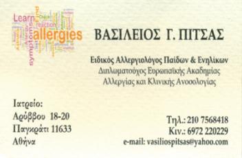 customer tabsΕπικοινωνίαΔιάγνωση αλλεργικών παθήσεων: αλλεργία σε τροφές, φάρμακα, τσιμπήματα από σφήκες, μέλισσες.Αλλεργία σε γύρεις φυτών,δέντρων, τρίχωμα ζώων, μύκητες, οικιακή σκόνη, άλευρα.Διενέργεια δερματικών δοκιμασιών επιδερικών, ενδοδερμικών, επικόλληση αλλεργιογόνων στη ράχη,Διενέργεια τροφικών, φαρμακευτικών, ρινικών και βρογχικών προκλήσεων.Έναρξη ανοσοθεραπείας σε σφήκα, μέλισσα καθώς και σε εισπνεόμενα αλλεργιογόνα.Διαχείριση χρονίας κνίδωσης και αγγειοοιδήματος.Το ιατρείο λειτουργεί κάθε Παρασκευή με προγραμματισμένα ραντεβού. 2ο ιατρείο: Αρύββου 18-20 ΠαγκράτιΤηλ. 2107568418 ΑλλεργιολόγοιΥγείαΒενιζέλου Ελευθερίου 12, ΑμαλιάδαΑρύββου 18-20, ΠαγκράτιΑΜΑΛΙΑΔΑ ΗΛΕΙΑΣΗΛΕΙΑΠΕΛΟΠΟΝΝΗΣΟΣ 2622020044 2107568418 6972220229vasiliospitsas@yahoo.com Το προτείνω (έχει προταθεί 0 φορές) ΦωτογραφίεςFacebook LikeShare on FacebookTweet Widget